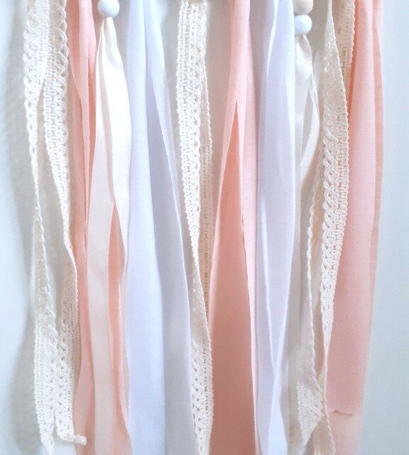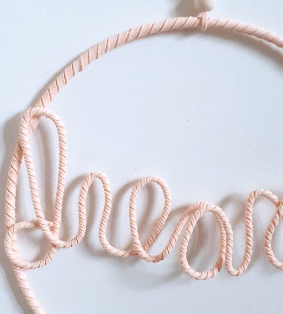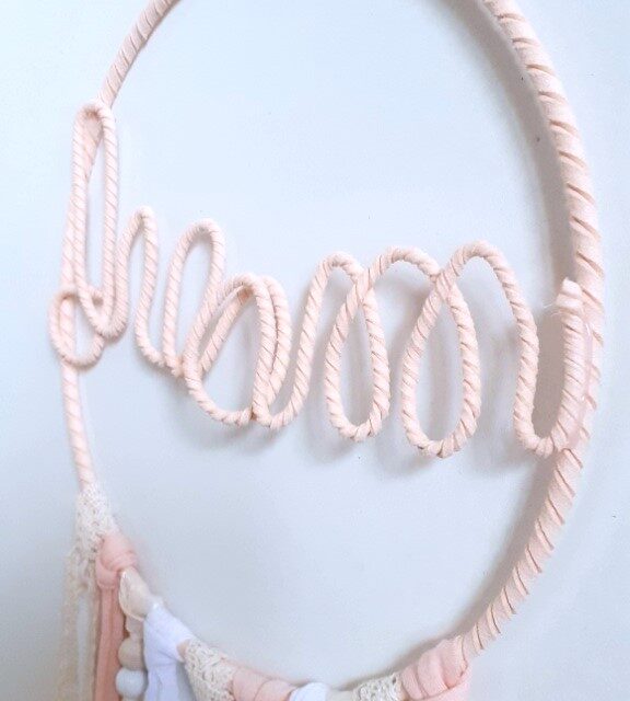 Attrape-rêves en perles et tissus, avec écriture dream, couleur rose clair et blanc. Propre et en très bon état général. Diamètre du cercle 19,5cm. Longueur totale d’un bout à l’autre 63cm.