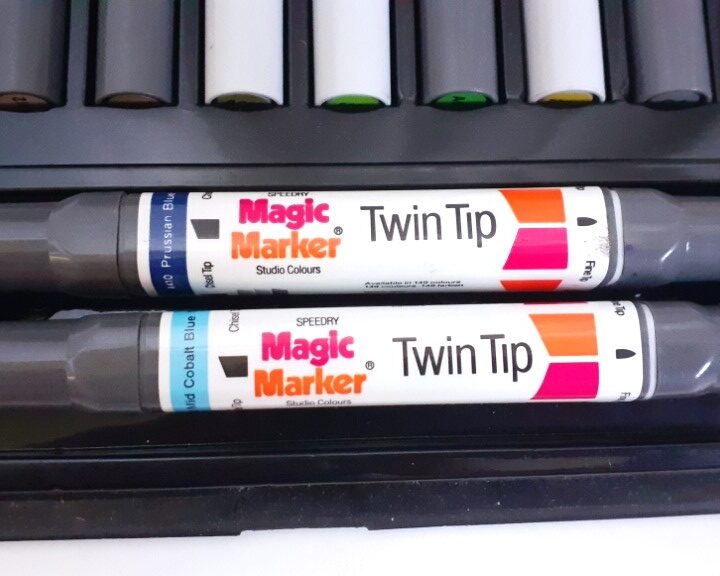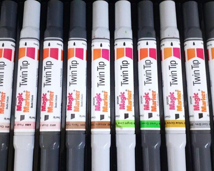 Lot de 14 marqueurs double pointe Speedry Magic Marker Royal Twin Tip set Royal Sovereign. Tous en très bon état de fonctionnement. La pochette de rangement a bien servi et le système de scratch pour la maintenir fermée s’est décollé et donc ne fonctionne plus. J’ai d’autres matériel de loisirs créatifs à vendre.