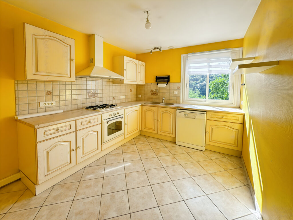 À l’étage : dégagement couloir, une cuisine aménagée et équipée, un séjour/salle-à-manger, trois chambres, une salle de bains et un cabinet d’aisance.
