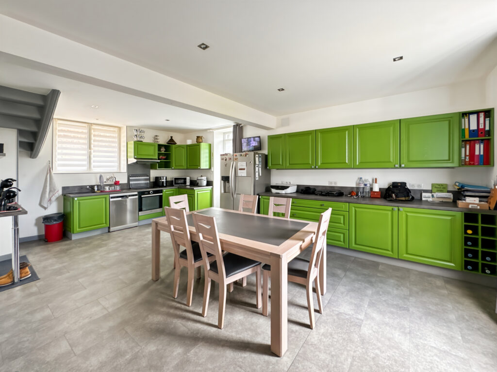 En rez-de-jardin : une cuisine ouverte aménagée et équipée, un salon/salle-à-manger, un bureau et une chambre.