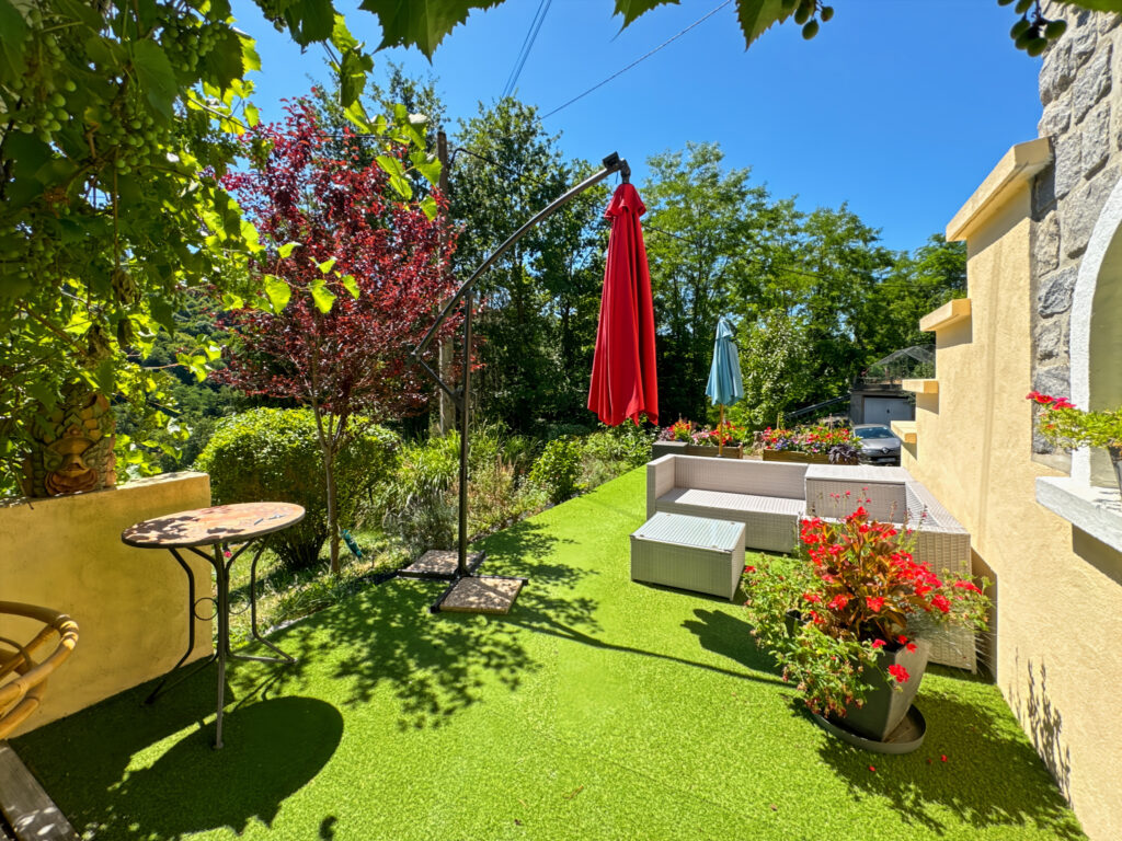À cela s’ajoute une grande terrasse et deux garages ! Possibilité de stationner plusieurs véhicules.