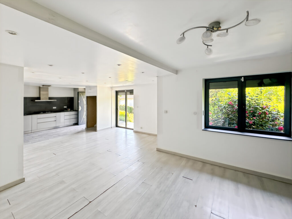 Au rez-de-chaussée : un séjour/salle-à-manger, une cuisine ouverte aménagée et équipée et une salle d’eau avec un cabinet d’aisance.