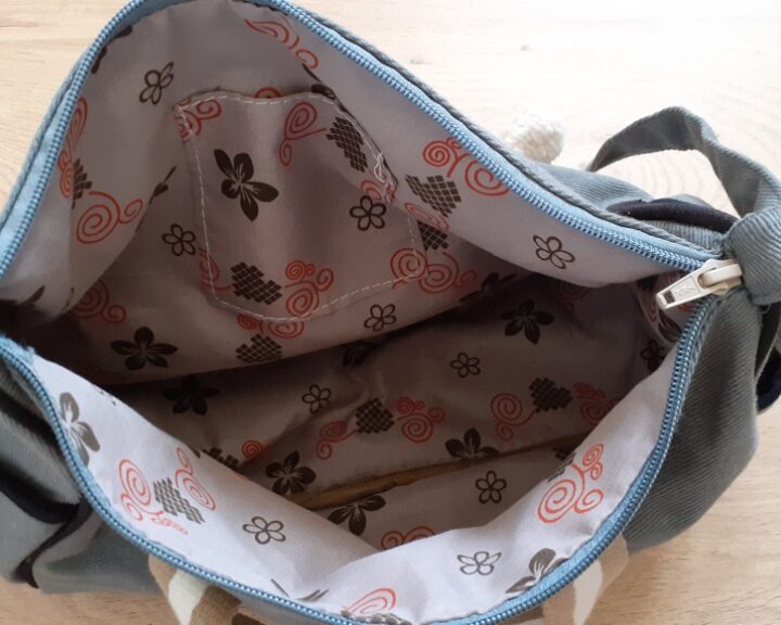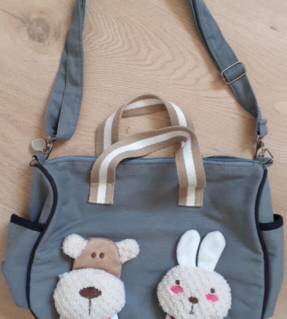 Sac à bandoulière en tissu / coton pour enfant, couleur kaki, avec fermetures éclair et nombreuses poches. Intérieur doublé. Décoration peluches animaux toutes douces sur le devant. La longueur de la bandoulière est réglable. Très jolies finitions et parfaitement propre, sans défaut.